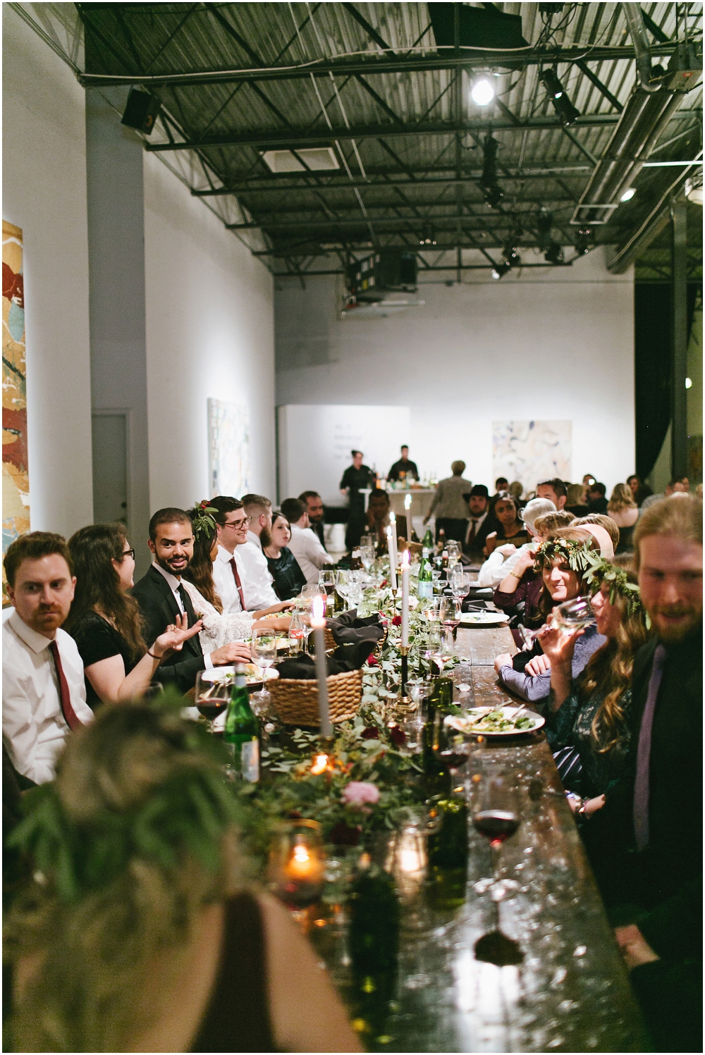 everything about their sweet december day was absolutely, hands down, true to who they are. from her gorgeous dress and flower crown, to the art gallery full of little details. their friends and family were welcomed into such a warm and intimate atmosphere where love was definitely felt. two of the highlights of their day for me where 1. carla locking eyes with me during the ceremony, because i think that's when it hit her that it was her freaking wedding day! i saw her get a little emotional, and truthfully because i'm a sap who cries when anyone else is crying, i had to look away! and 2. her parents surprised them with a custom painting from one of their favorite local artists - definitely check out his work and the special piece they had commissioned! it highlights noda and a lot of brett & carla's favorite spots together.